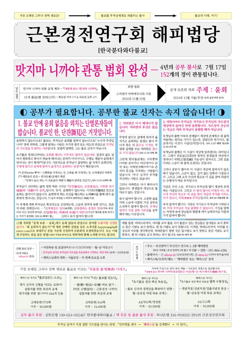 「맛지마 니까야 관통 법회」가 2024년 7월 17일에 관통됩니다. 이어서 15주간의 품(品)별 정리를 통해 완성되는데, 스리랑카 마하매우나워 사원에서 진행하는 회향 법회와 공개토론회(주제 : 윤회) 계획에 대해 7월 9일자 불교신문에 전면광고를 게재하였습니다.