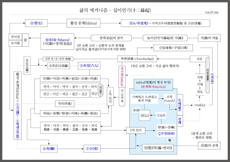 ● 대부분의 경에서 오온이나 육외입처를 대상으로 서술되지만, 구체적 삶에서는, (MN 38-애(愛)의 부서짐의 큰 경)/(MN 148-육육(六六) 경)의 용례처럼 십이처(十二處)에서 활성화된 수(受)를 기뻐하고 드러내고 묶여 머무는 것으로 이해해야 합니다.