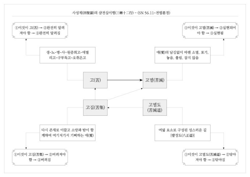 그런데 경은 사성제에 대한 두 가지 분류를 보여줍니다. ― ①차제설법(次第說法)과 삼전십이행(三轉十二行), ②포괄적 사성제와 심층적 사성제