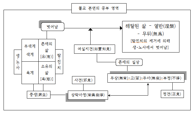 ※ 생(生)-노(老)-사(死)의 세 가지 법이 세상에 존재한다는 것의 의미 ㅡ 존재에 내재한 문제가 있다는 것 → 나는 참된 것으로의 아(我)[attan]가 아님 → 무아(無我)-비아(非我)[anattan] → 존재의 실상(實相) = 무상(無常)-고(苦)-무아(無我)[참되지 않은 것]