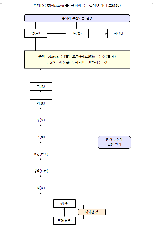 한편, 십이연기(十二緣起)는 괴로움의 발생의 조건 관계를 밝힌 부처님 깨달음의 중심 교리인데, 이런 이해에 의하면 존재[유(有)-bhava]를 오취온(五取蘊) 또는 유신(有身)이라고 설명하는 위에서 존재로서의 삶에 수반되는 현상으로의 생(生)-노사(老死) 그리고 존재가 불완전한 상태로 생겨나는 과정의 조건 관계로서의 무명(無明)~취(取)로 구성된다는 것을 알 수 있습니다.