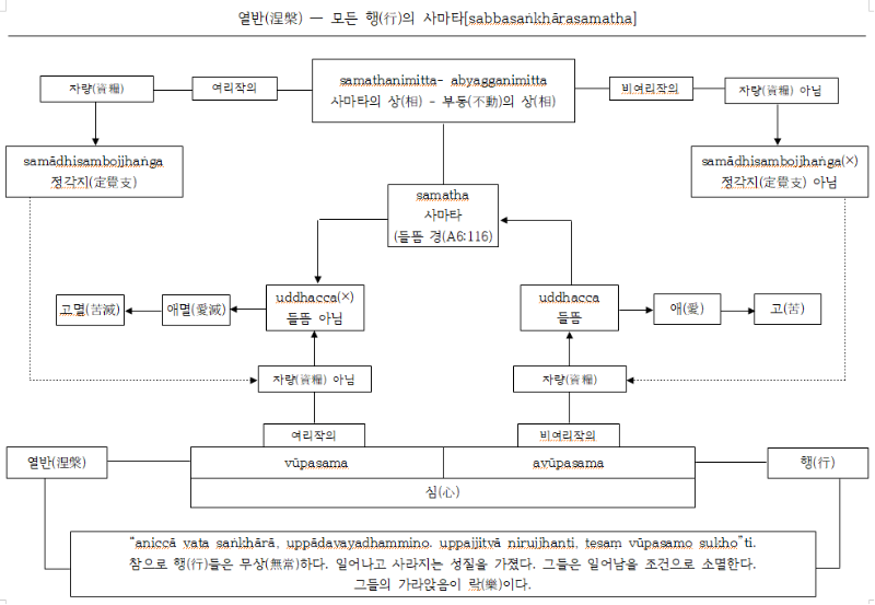 그러므로 열반을 정의하는 확장된 개념인 sabbasaṅkhārasamatho는 사마타-위빳사나에 의해 심(心)의 형성과정의 문제[무명(無明)과 탐(貪)]를 해소하여 사념처에 의한 들뜸의 제어를 흔들림 없이 유지하는 것을 의미합니다. ⇒ 부동(不動)의 심해탈(心解脫)
