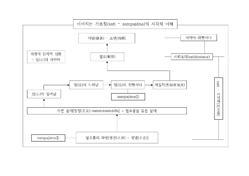 이 내용은 삼매수행(三昧修行)에 대한 이해 즉 수행지도(修行地圖) 위에서 설명됩니다. sati의 강화 즉 사념처(四念處)는 바른 삼매[정정(正定)]의 성취를 위한 필수품의 과정으로부터 sati의 완성[염오(厭惡)] 즉 사띠토대(satiāyatana)의 구축까지를 영역으로 합니다. 그리고 사띠토대(satiāyatana) 위에서 사마타[이탐(離貪)]-위빳사나[소멸(消滅)]의 과정을 통해 깨달음은 성취됩니다. 이때, sampajānakārī는 바른 삼매의 성취를 위한 필수품의 과정이고, dhammavipassanā는 삼매 위에서 드러나는 법을 관찰하여 여실지견(如實知見)으로 이끄는 과정입니다. 즉 사념처(四念處)의 과정 안에 두 가지 sampajāna[정지(正知)]가 속해있는 것입니다.