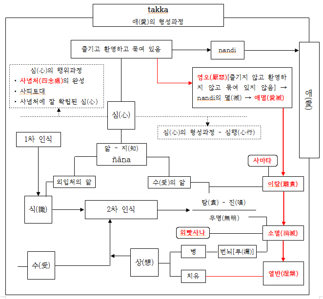 심(心)은 상(想)-수(受)의 과정을 통해 생겨납니다. 그리고 생겨난 심(心)은 즐기고 환영하고 묶여 있음의 과정을 통해 난디를 만들어서 갈애[애(愛)]가 됩니다. 그래서 갈애는 심(心)이 난디와 함께한 상태입니다. 또한, 심(心)의 형성과정이 식(識)이 탐(貪)으로 부풀린 것이기 때문에 식(識)이 난디와 탐(貪)과 함께한 상태이기도 합니다.