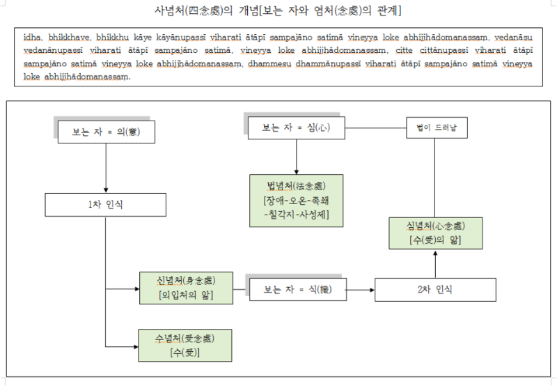 또한, 보는 자와 염처(念處)의 관계에서 설명하였는데, 2차 인식의 자리에서 식(識)이 수(受) 즉 cittassa nimitta를 붙잡지 못하면 삼매를 성취하지 못한다는 점을 강조하였습니다. 이 내용은 나중에 입출식념경의 해석에서 심념처의 완성에 대한 해석이 근거가 될 것입니다.