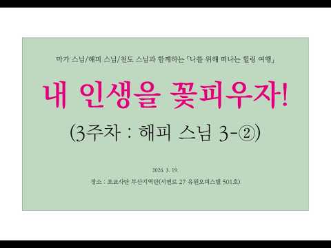 ▣ 「(마가-해피-천도 스님) 나를 위해 떠나는 힐링 여행」 3주차 해피 스님②[열반으로 이끄는 도관 ― 눈뜬 자들의 행렬(지혜) & 질서로운 삶(사띠) → 공덕](2026.3.19.)