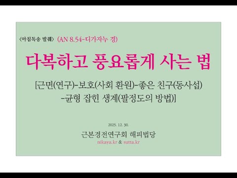 ▣ (아침독송 발췌 251230) (AN 8.54-디가자누 경)[다복하고 풍요로운 삶을 사는 방법 – 근면(연구)-보호(사회 환원)-좋은 친구(동사섭)-균형 잡힌 생계(팔정도의 방법)](근본경전연구회 해피스님)