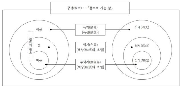이런 이해는 욕계(慾界)-색계(色界)-무색계(無色界)의 중생 세상에 대한 이해와 괘를 같이 합니다. 마음과 몸으로 구성된 내가 세상을 만나는 이야기로의 삶에서 마음-몸-세상 모두에 대한 집착과 경향[욕상(慾想)]으로 살아가는 질적 세상이 욕계(慾界)이고, 물질 세상 즉 kāmaguṇā(소유의 사유에 묶인 것)[색(色)-성(聲)-향(香)-미(味)-촉(觸) : 밖의 색(色)]에 대한 집착과 경향을 극복하고 마음과 몸[안의 색(色)]에 대한 집착과 경향[색상(色想)]으로 살아가는 질적 세상이 색계(色界)이며, 몸[안의 색(色)]에 대한 집착과 경향을 극복하고 마음에 대한 집착과 경향[무색상(無色想)]만으로 살아가는 질적 세상이 무색계(無色界)이므로, 거친 아(我)와 욕계(慾界)의 존재, 의성(意成)인 아(我)와 색계(色界)의 존재, 상성(想成)인 아(我)와 무색계(無色界)의 존재라는 각각의 대응은 타당합니다.