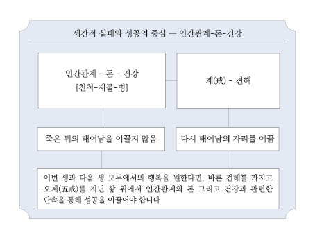 자연과학의 발전 위에서 물질 만능적 사회상을 보여주는 요즘 세상에서 특히 주목해야 할 점은 이번 생에서도 오직 돈만이 성공 또는 행복을 결정하지 않는다는 점입니다. 돈만큼이나 인간관계와 건강도 중요하고, 다음 생까지를 보는 현명함으로 오계(五戒)를 지니고 바른 견해로써 세상을 보아야 바르게 삶을 행복으로 이끌 수 있습니다.