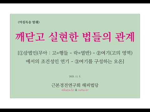 ▣ (아침독송 발췌 251105) 깨닫고 실현한 법들의 관계[①삼법인(무아 : 고=행들 - 락=열반) - ②여기(고의 영역)에서의 조건성인 연기 - ③여기를 구성하는 오온](해피스님)
